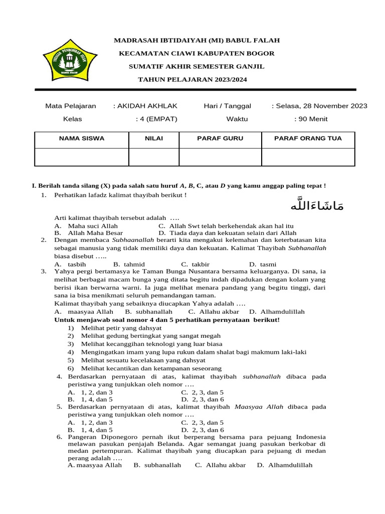 Pendidikan agama, khususnya Akidah Akhlak, memegang peranan krusial dalam pembentukan karakter anak. Di jenjang Sekolah Dasar kelas 2, materi Akidah Akhlak dirancang untuk mengenalkan konsep-konsep dasar keimanan dan akhlak terpuji secara sederhana dan mudah dipahami. Memahami materi ini tidak hanya sebatas menghafal, tetapi lebih kepada menanamkan nilai-nilai tersebut dalam perilaku sehari-hari. Latihan soal menjadi alat evaluasi yang efektif untuk mengukur sejauh mana pemahaman siswa terhadap materi yang telah diajarkan. Artikel ini bertujuan untuk menyajikan berbagai contoh soal Akidah Akhlak semester 1 kelas 2 SD yang dapat dijadikan referensi bagi guru dalam menyusun evaluasi pembelajaran, serta bagi orang tua untuk mendampingi putra-putrinya belajar di rumah.